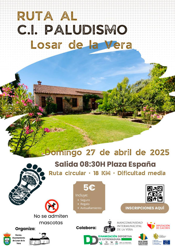 La Ruta al C.I. Paludismo tendrá lugar el domingo 27 de abril de 2025 sobre una distancia de 18 km circular y de dificultad media. La salida será en Plaza de España (Losar de la Vera) a las 8:30h.